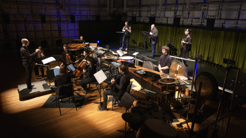 The piece brought together performers D. Andrew Stewart, Tom Mays, and Huizi Wang, Ensemble Éclat conducted by Charles-Éric Fontaine, and technical assistants Vincent Cusson and Quentin Lauvray.